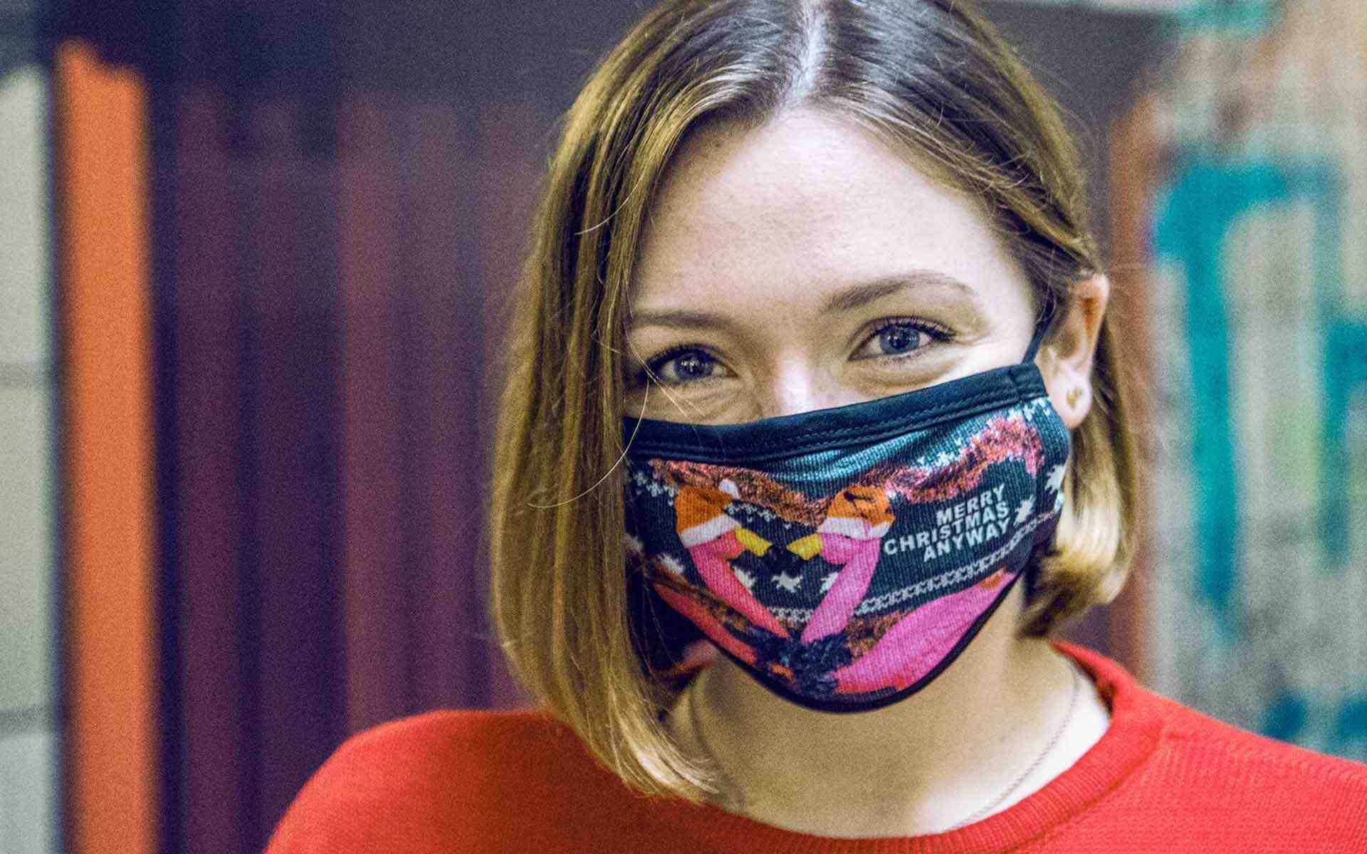 Unsere Ugly Christmas Masks bestehen aus einem atmungsaktiven Obermaterial (DRI-Fit), einem 3-Schicht Baumwoll-Mesh und einem Innenteil aus weicher, gekämmter Baumwolle.
